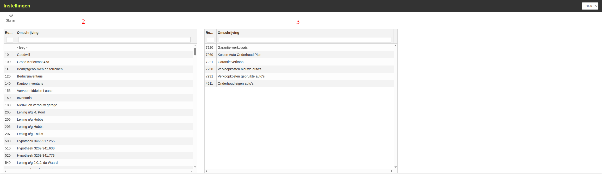 Een grootboek verwijderen uit deze kolom doe je met de DELETE-knop of klik je dubbel op -leeg- bovenaan de grootboekenkolom (2)