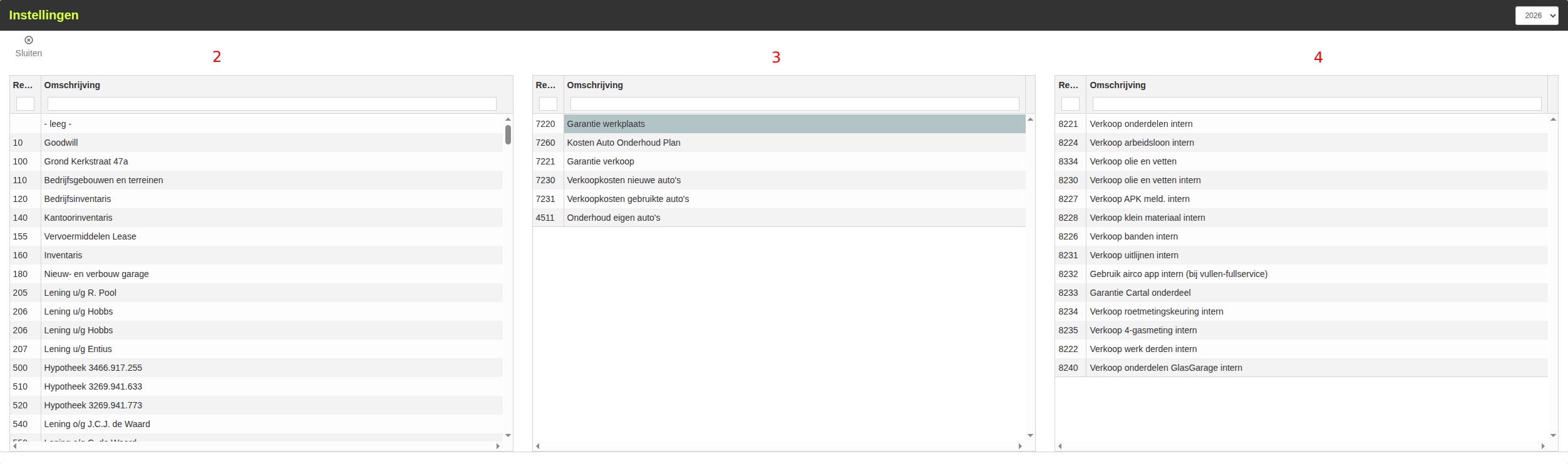 Als je vervolgens in de middelste kolom (3) een grootboek aanklikt komt er aan de rechterkant een kolom bij (4).